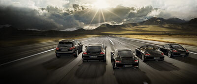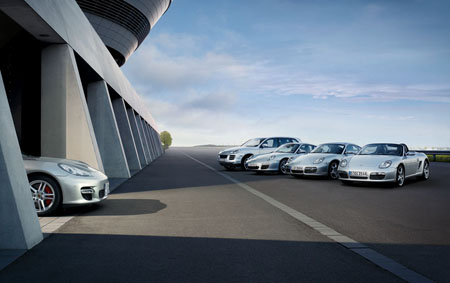 The 2010 Porsche lineup, incl. the Porsche Panamera hidden on the left.